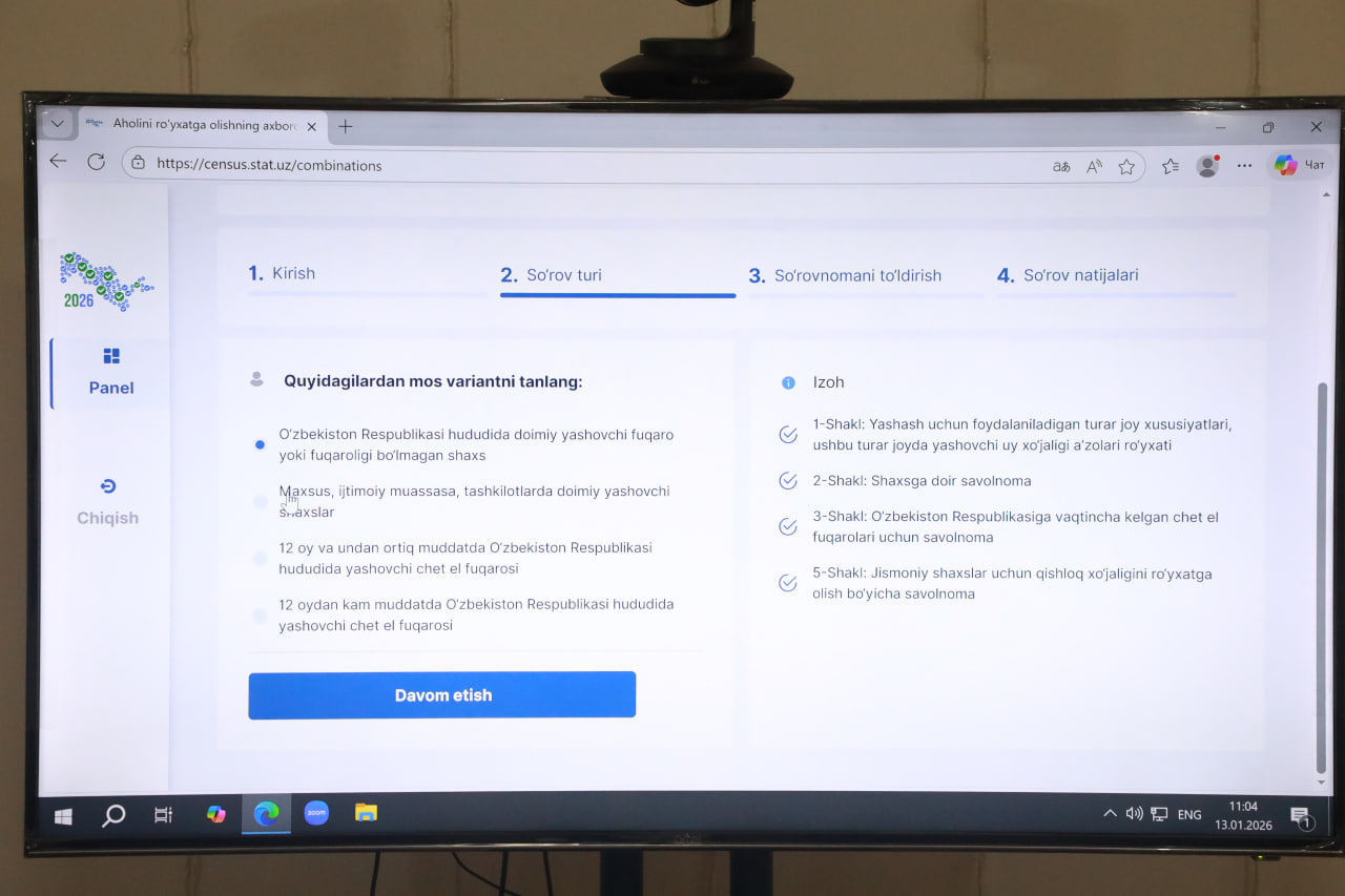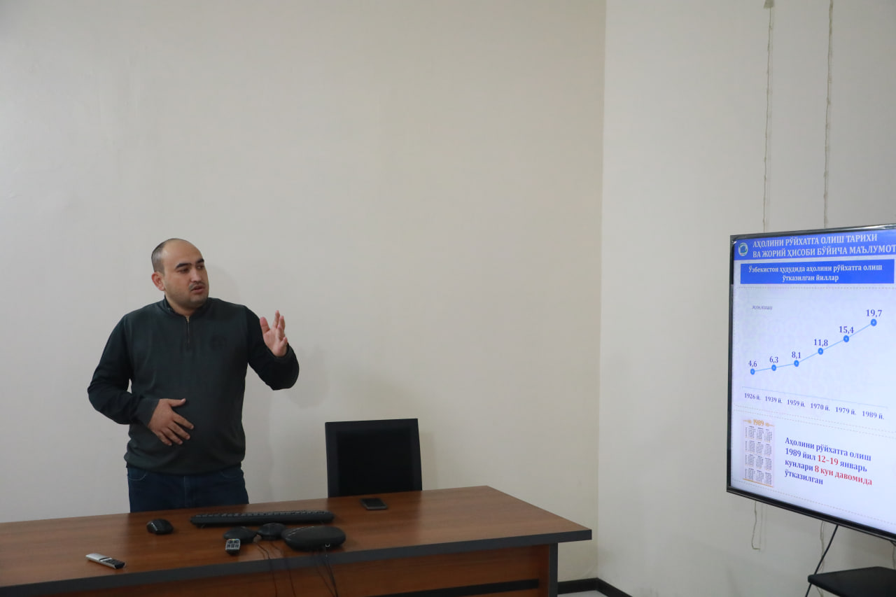 Joriy yilning 13-yanvar kuni Buxoro viloyati statistika boshqarmasida O'zbekiston Respublikasi Favqulodda vaziyatlar vazirligi O'MT va AOFVB "LUOK" XK MCHJ obyektlarida favqulodda vaziyatlar markazi viloyat bo'limi xodimlari ishtirokida o'quv seminari tashkil qilindi. Seminar davomida ishtirokchilarga ro‘yxatga olish jarayonining ahamiyati va ushbu tadbirdan kutilayotgan natijalar shuningdek, zamonaviy raqamli texnologiyalar yordamida ro'yxatga olishga oid so‘rovnomani to‘ldirish usullari, onlayn platformaning imkoniyatlari tushuntirildi va 15-yanvardan boshlab onlayn ro'yxatga olish jarayonlarida faol ishtirok etishlari so'raldi. Seminar yakunida ishtirokchilar o'zlarini qiziqtirgan savollarga javob olishdi.