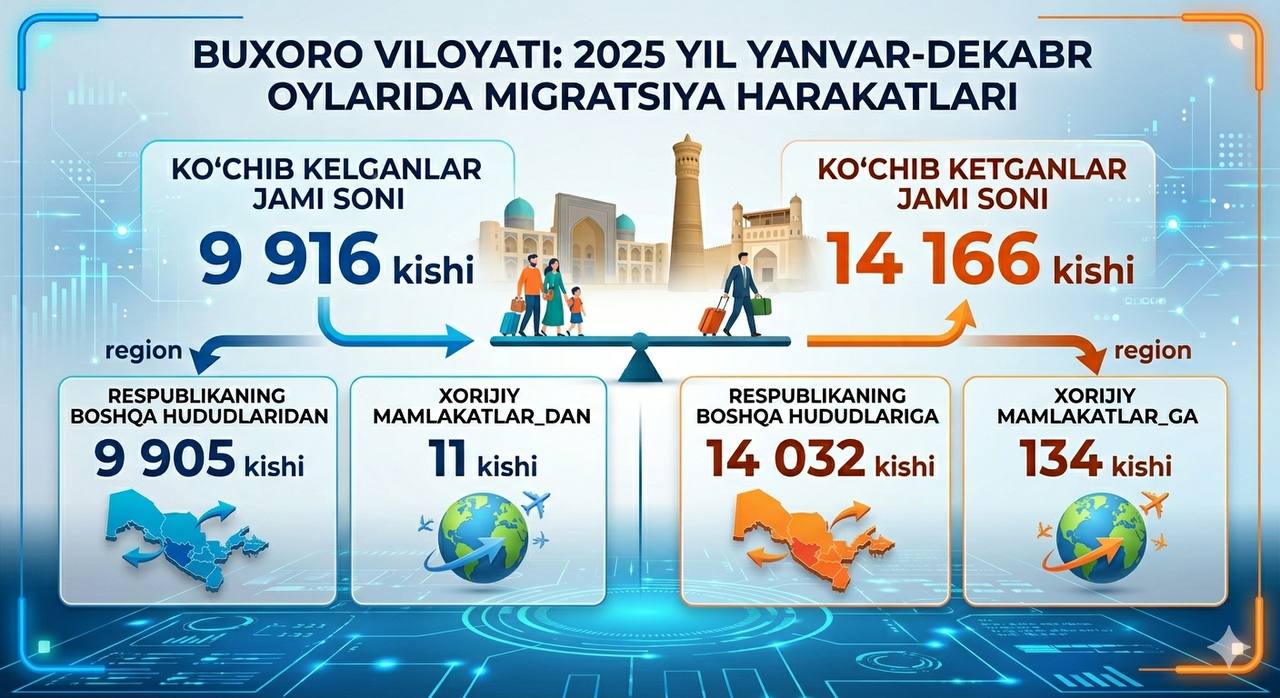 2025-yil yanvar-dekabr oylarida viloyat boʻyicha koʻchib kelganlar jami soni 9 916 kishini, shu jumladan respublikaning boshqa hududlaridan koʻchib kelganlar 9 905 kishini, xorijiy mamlakatlardan koʻchib kelganlar 11 kishini tashkil etdi. Koʻchib ketganlar jami soni 14 166 kishini, shu jumladan respublikaning boshqa hududlariga koʻchib ketganlar 14 032 kishini, xorijiy mamlakatlarga koʻchib ketganlar 134 kishini tashkil qildi.