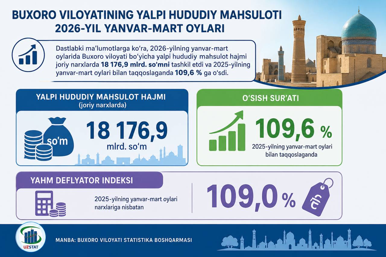 Dastlabki ma’lumotlarga ko‘ra, 2026-yilning yanvar-mart oylarida Buxoro viloyati bo‘yicha yalpi hududiy mahsulot hajmi joriy narxlarda 18 176,9 mlrd so‘mni tashkil etdi va 2025-yilning yanvar-mart oylari bilan taqqoslaganda 109,6 % ga o‘sdi.